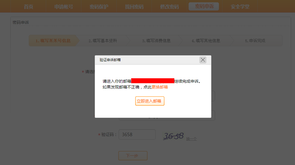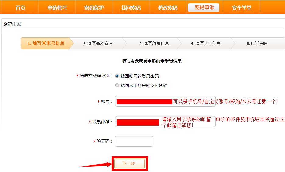 1.登陆“淘米账户中心”,点击“密码申诉”,按照页面内的要求填写信息,填写验证码,确认无误后点击“下一步”。