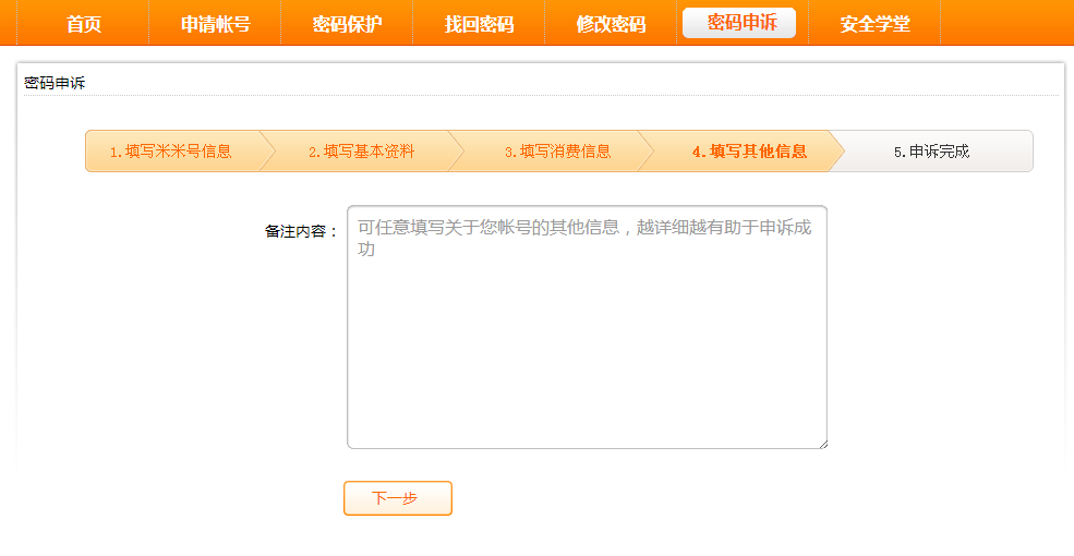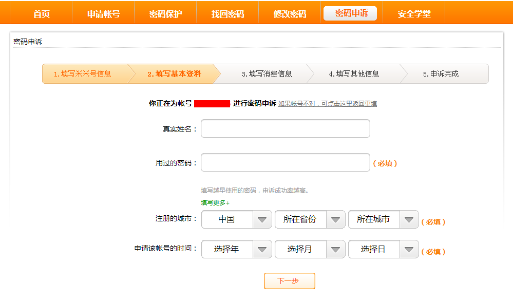 4.进入申诉页面,根据要求,认真填写相应的信息!确认无误后点击“下一步”