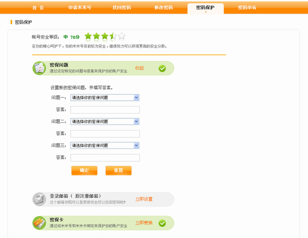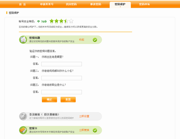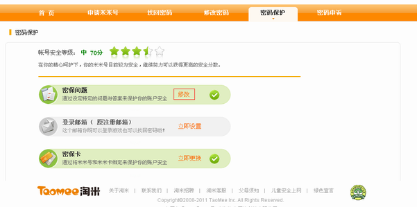 1.进入淘米帐户中心密码保护页面,点击密保问题的“修改”按钮。 如果密保问题已忘记,请直接进行密码申诉。点此查看申诉小技巧。