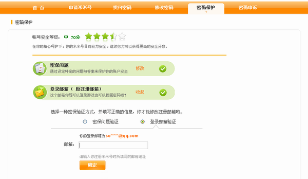 ① 输入注册该米米号时填写的邮箱,点击确定;