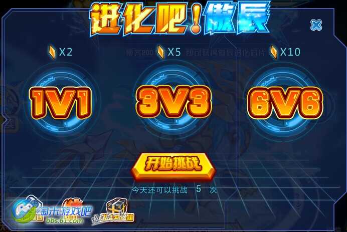 选择挑战模式,有1v1,2v2、6v6,模式不同奖励也不同;