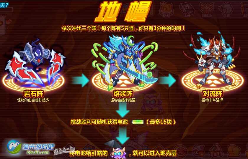 进入地幔层后,需要进行三轮挑战(岩石阵、熔浆阵和对流阵),每个阵法3分钟,在这时间内战胜它们;