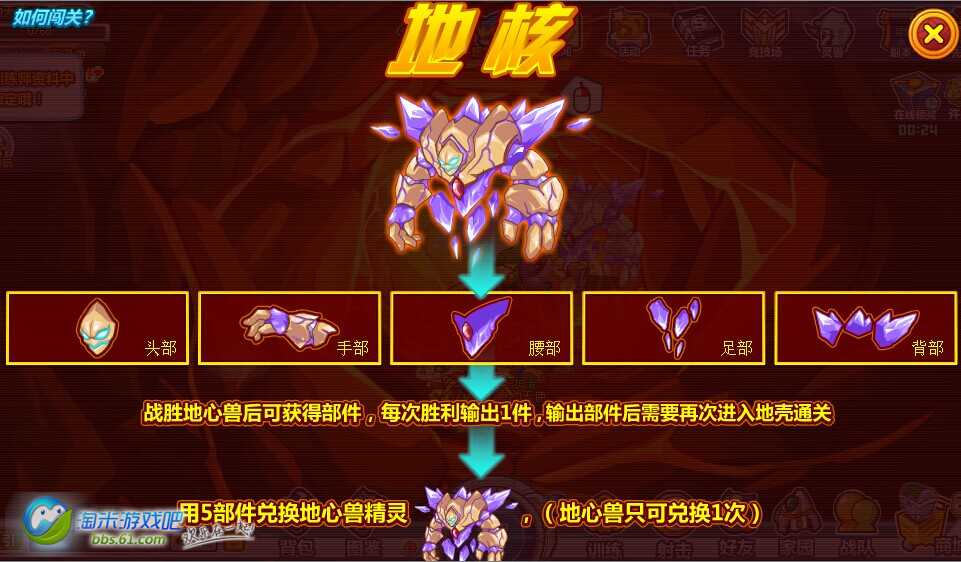 挑战地心兽即可获得部件,每战胜一次获得一件,每获得一件后都要重新从地壳层开始挑战,集满五个部件就能兑换“地心兽--格萨拉克”了!