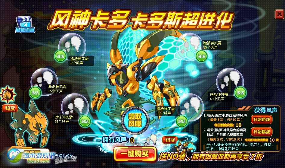 要获得“风神卡多”,必须先获得精灵【卡多斯】和进化材料【风眼】。【风眼】通过“卡多斯超进化 风神卡多”活动,激活六个【风声】后领取