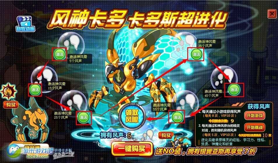 通过小游戏和挑战精灵收集【风声】, 按顺序用【风声】激活6个风神祭台,就可领取卡多斯的【风眼】,超进化为风神卡多啦!