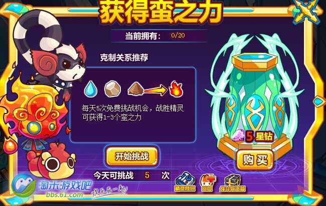 打败火系精灵(满级精灵直接打)就有机会获得1-3个【蛮之力】(可星钻购买,5星钻/个),每天免费挑战5次,所以不花费星钻购买,一天肯定是收集不完的,运气好的至少两天,运气不好。。呵呵,4天~
