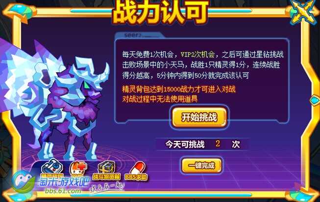 挑战场景中的小天马,战胜得分,连续战胜得分越高,5分钟内得到50分就过关,每天1次机会,VIP2次。直接满级精灵轻松碾压!