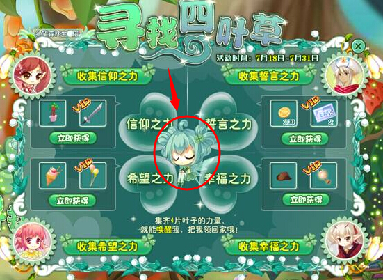 期间,参与【寻找四叶草】活动,信仰之力、誓言之力、希望之力、幸福之力四片叶片全部点亮,可获得花精灵王——岚。