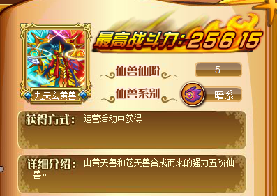 五阶仙兽:九天玄黄兽。获得渠道:限时活动合成获得。