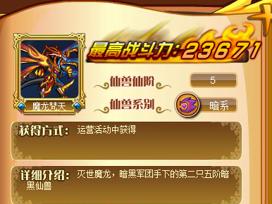 五阶仙兽:魔龙梵天。获得渠道:限时活动,合成获得。