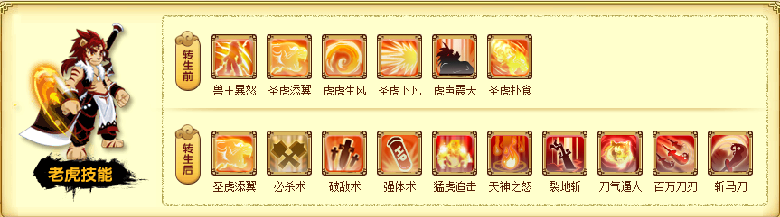 转生前的技能是:兽王暴怒,圣虎添翼,虎虎生威,圣虎下凡,虎声震天,圣虎扑食。