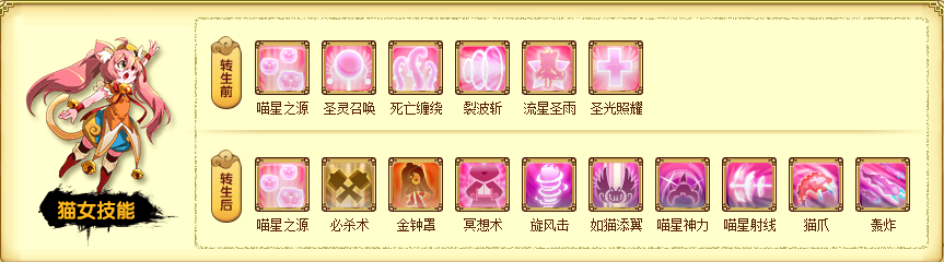 转生前的技能是:喵星之源,圣灵召唤,死忙缠绕,凌星圣雨,圣光照耀。